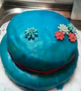 Beide Etagen mit dünn ausgerollter Marzipandecke bedecken. Man kann diese schon vorher mit Lebensfarbe einfärben. Ich habe aber aus Zuckerguss (Puderzucker mit Wasser vermischen) farbigen Anstrich hergestellt und die ganze Torte bezogen.